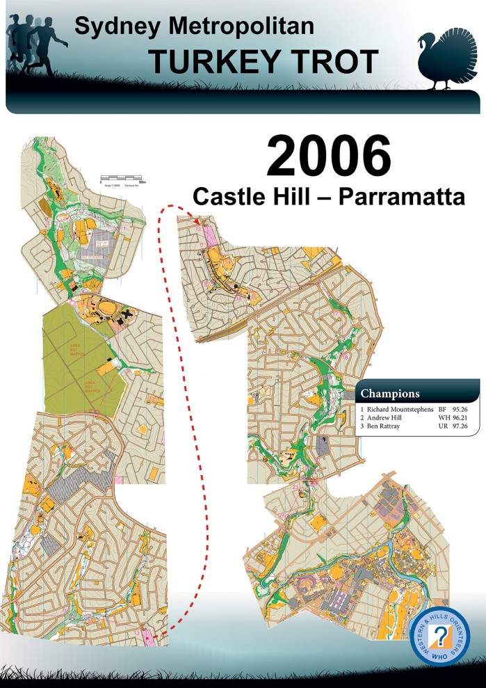 The Sydney Metropolitan Turkey Trot was first held in November 2005 and ran from Castle Hill to Parramatta Park. Since then, it has been an annual fixture on the orienteering calendar and in recent years has found a home on the first Sunday in July. Below are some of the combined maps of the Turkey Trot Long courses. The theme of this first Turkey Trot was "from the hills to the river".